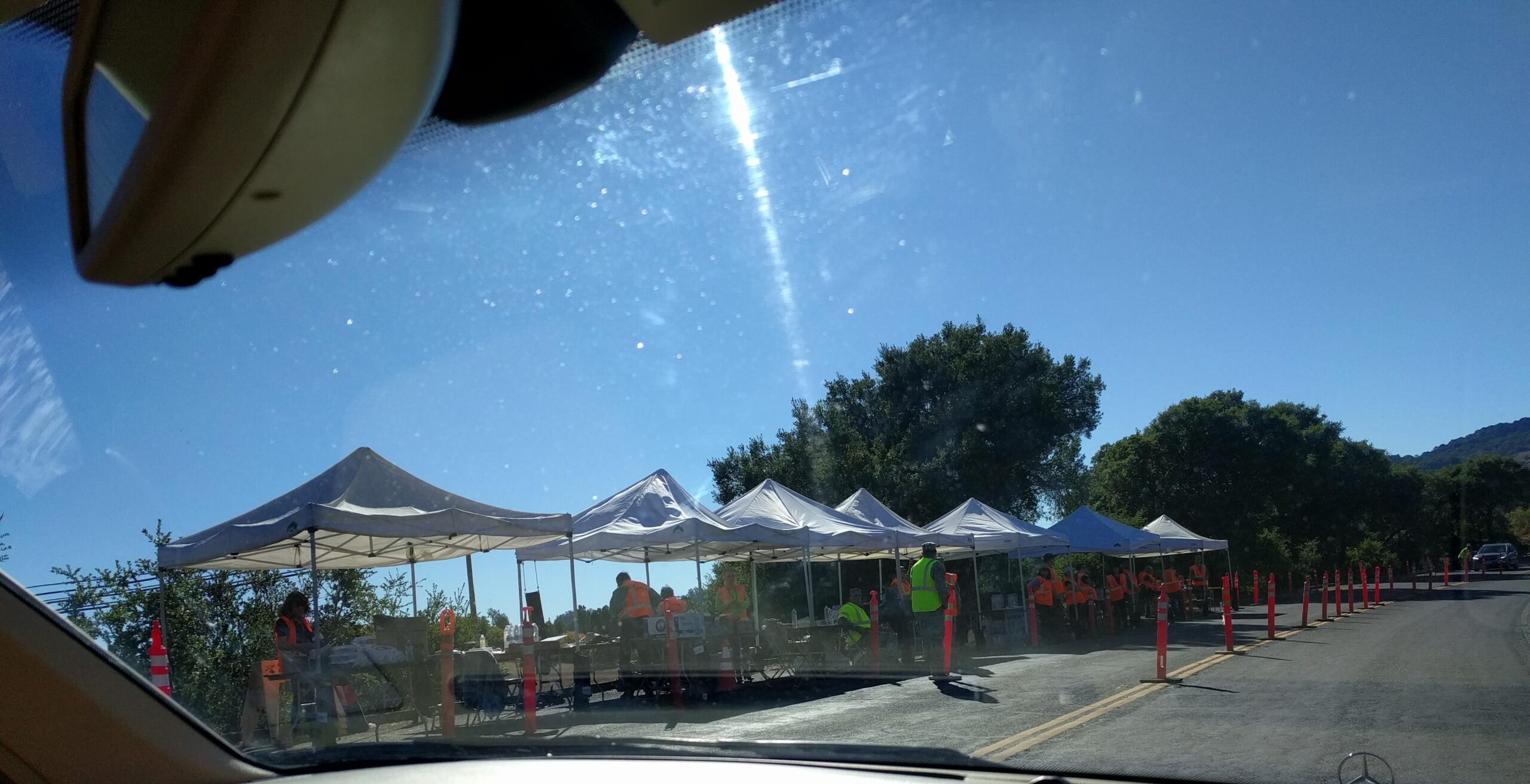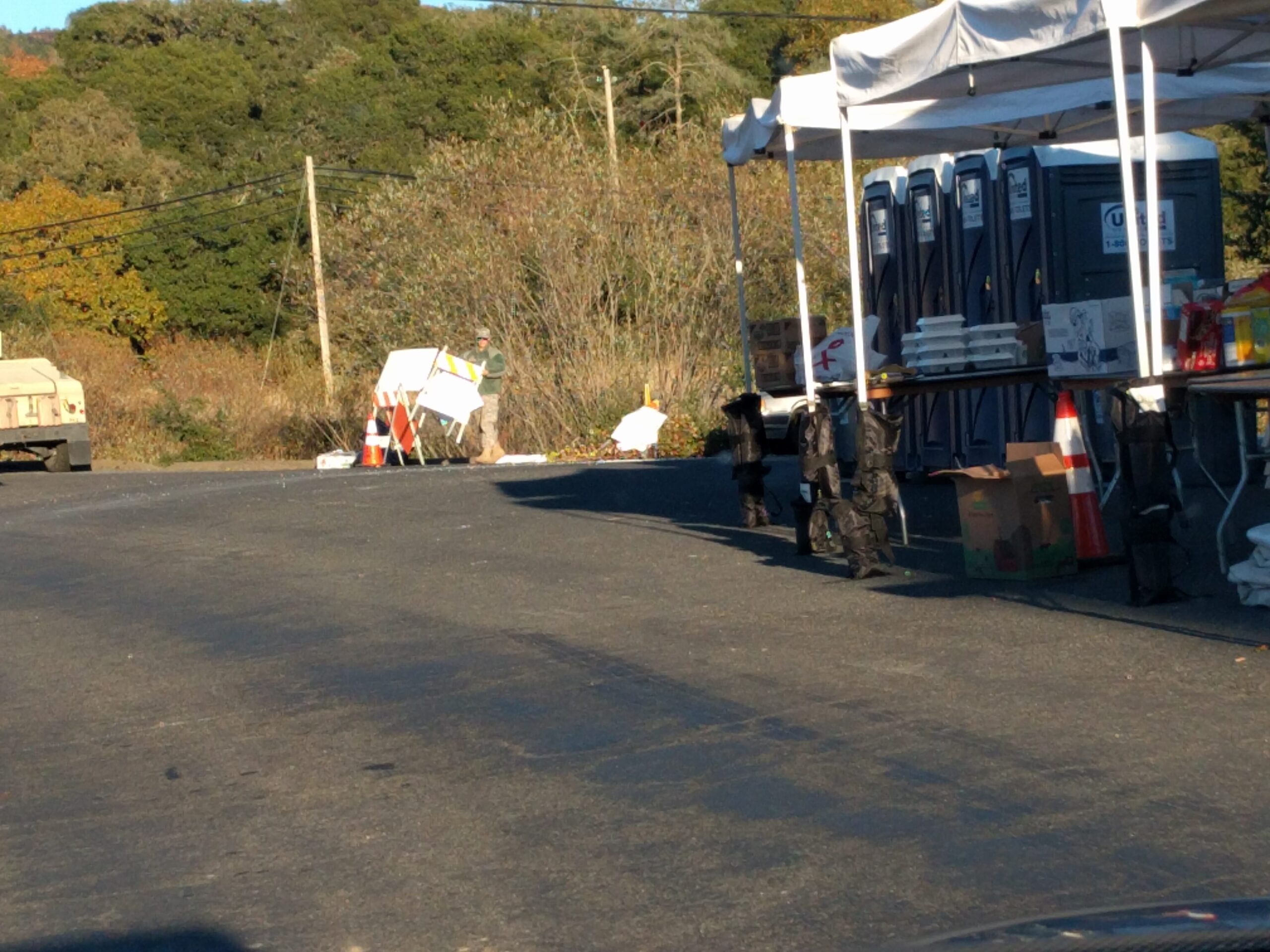 Tents with water, snacks and information at the exit from the evacuation zone.