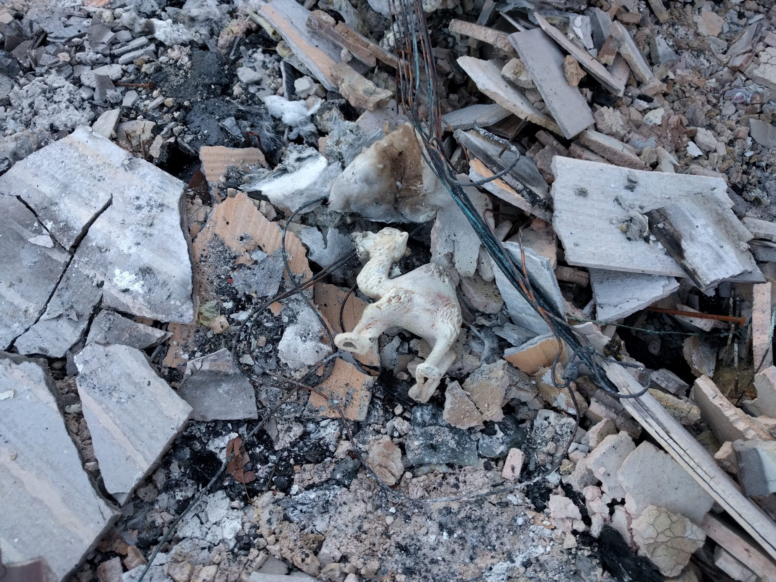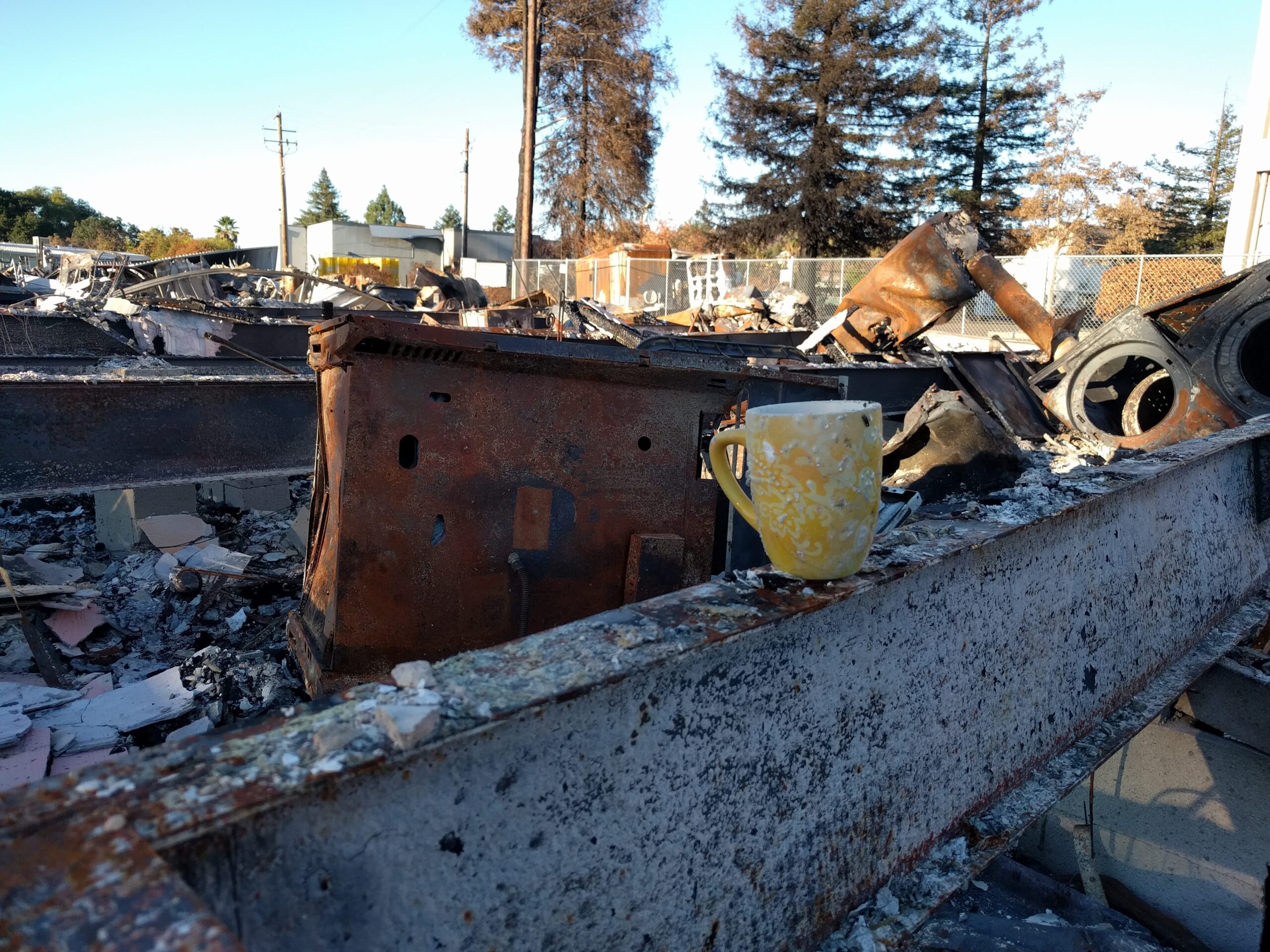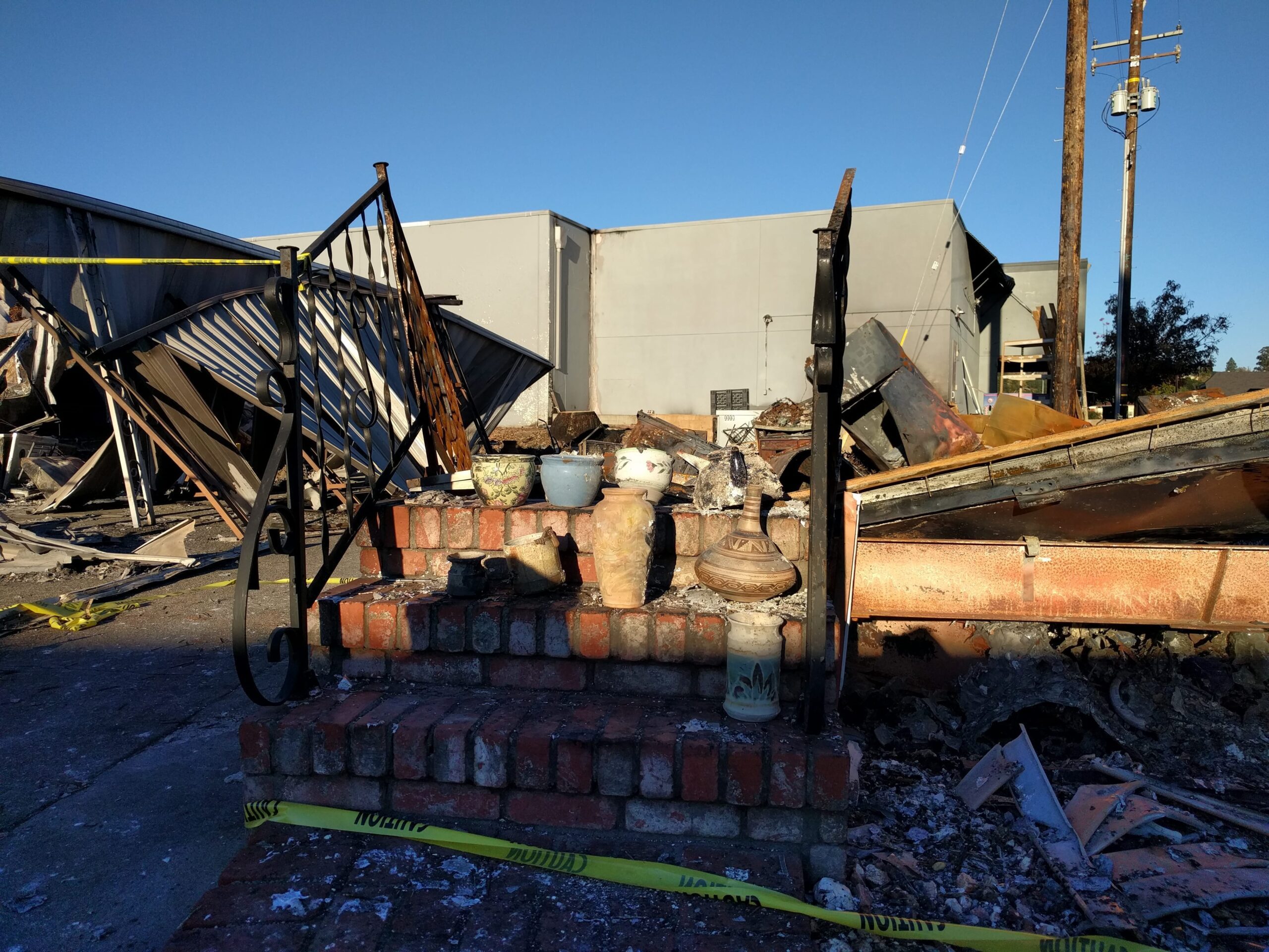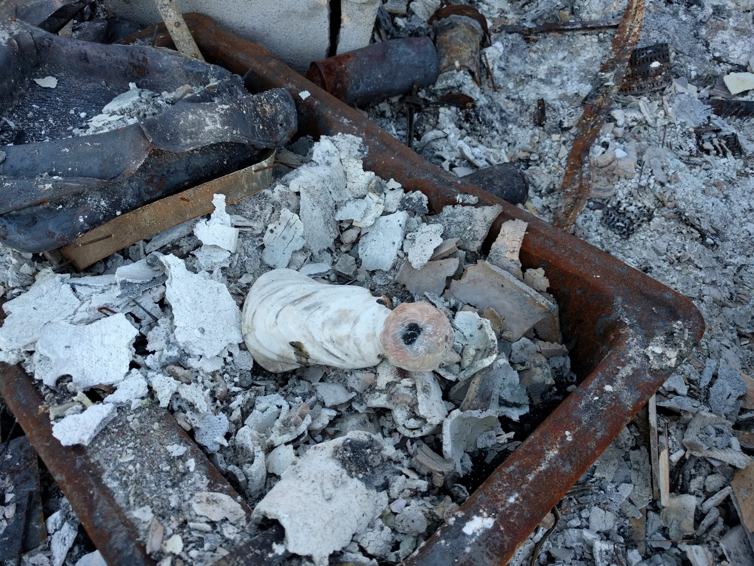 Gruzowisko po pożarze w Santa Rosa. Wśród popiołów kilka przedmiotów, które ktoś odnalazł i poukładał. / Debris after the fire in Santa Rosa. There are a few objects found in the ashes. Somebody organized them to bring memories back.