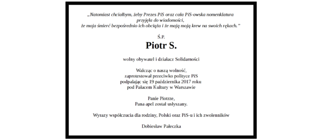 Piotr S. umarł 29 października 2017. Nie odzyskał przytomności. Przeczytaj pozostawiony przez niego list. Piotr S. self-immolated to protest against the politics of the Polish government. He died 29th October 2017. Here is the letter he left.